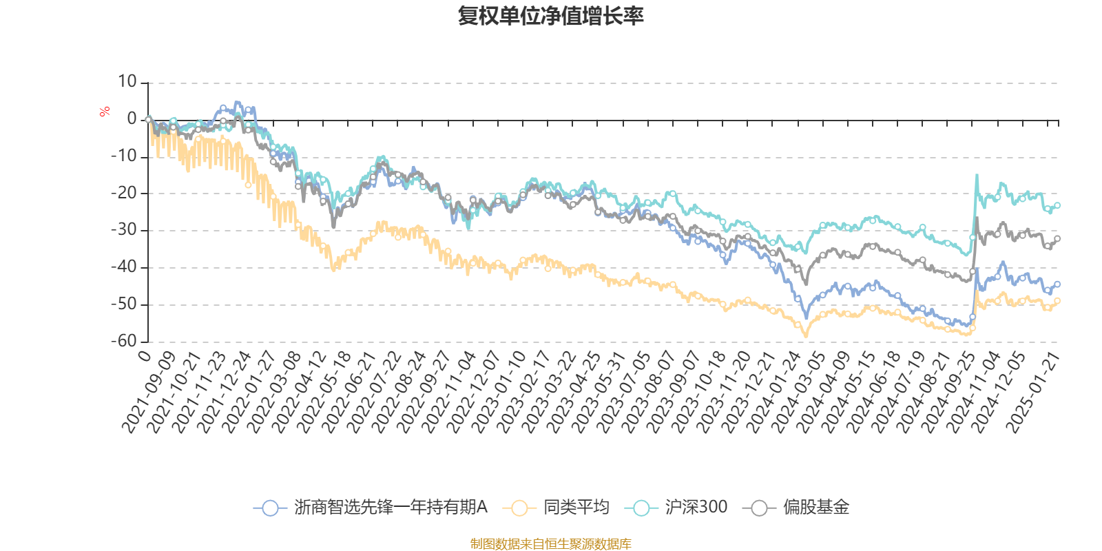 截至1月21日,浙商智选先锋一年持有期A近三个月复权单位净值增长率为-1.61%,位于同类可比基金409/646;近半年复权单位净值增长率为13.43%,位于同类可比基金231/645;近一年复权单位净值增长率为4.45%,位于同类可比基金521/633;近三年复权单位净值增长率为-41.24%,位于同类可比基金416/447。